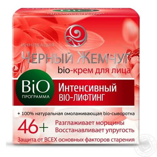 - Крем Чорний перли Біо-програма 46+. Дієвий препарат вітчизняних виробників з вираженим ліфтинг-ефектом. Вміст олії авокадо, каріте, вітамінів групи А, Е сприяє посиленню вироблення колагену, еластину, розгладженню зморшок і запобігання розвитку старіння шкірних покривів. Ціна 100-120 грн.